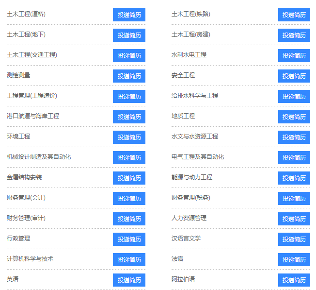 土木工程(道橋、鐵路、地下、房建、交通工程等)、水利水電工程、測繪測量、安全工程、工程管理(工程造價)、給排水科學(xué)與工程、港口航道與海岸工程、地質(zhì)工程、環(huán)境工程、水文與水資源工程、機械設(shè)計制造及其自動化、電氣工程及其自動化、金屬結(jié)構(gòu)安裝、能源與動力工程、財務(wù)管理(會計、稅務(wù)、審計)、人力資源管理、行政管理、漢語言文學(xué)、計算機科學(xué)與技術(shù)、法語、英語、阿拉伯語等專業(yè)。